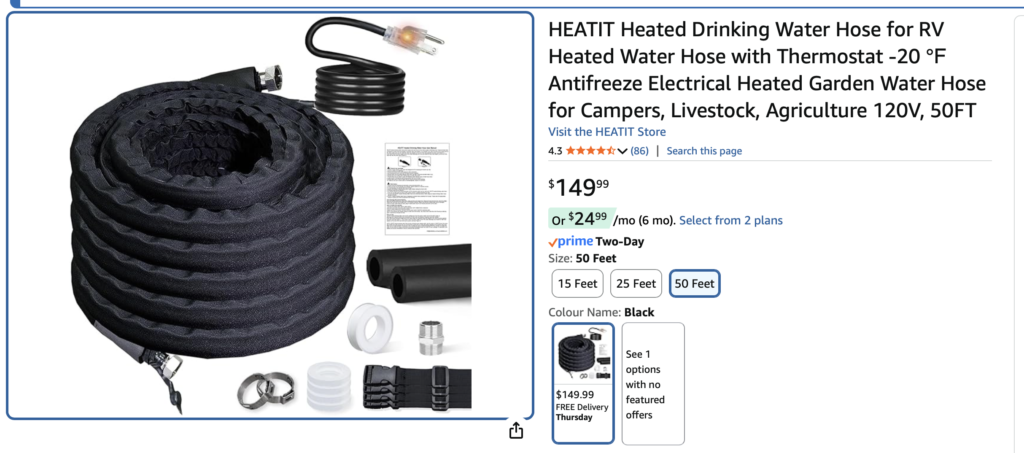 The hose is suitable for drinking water, has sensors at both ends for the cold (more on that later), and is generally speaking a fairly heavy duty piece of kit. I got the 50 foot long variety- longer than I needed by a good 20′, but I prefer to have some flexibility.